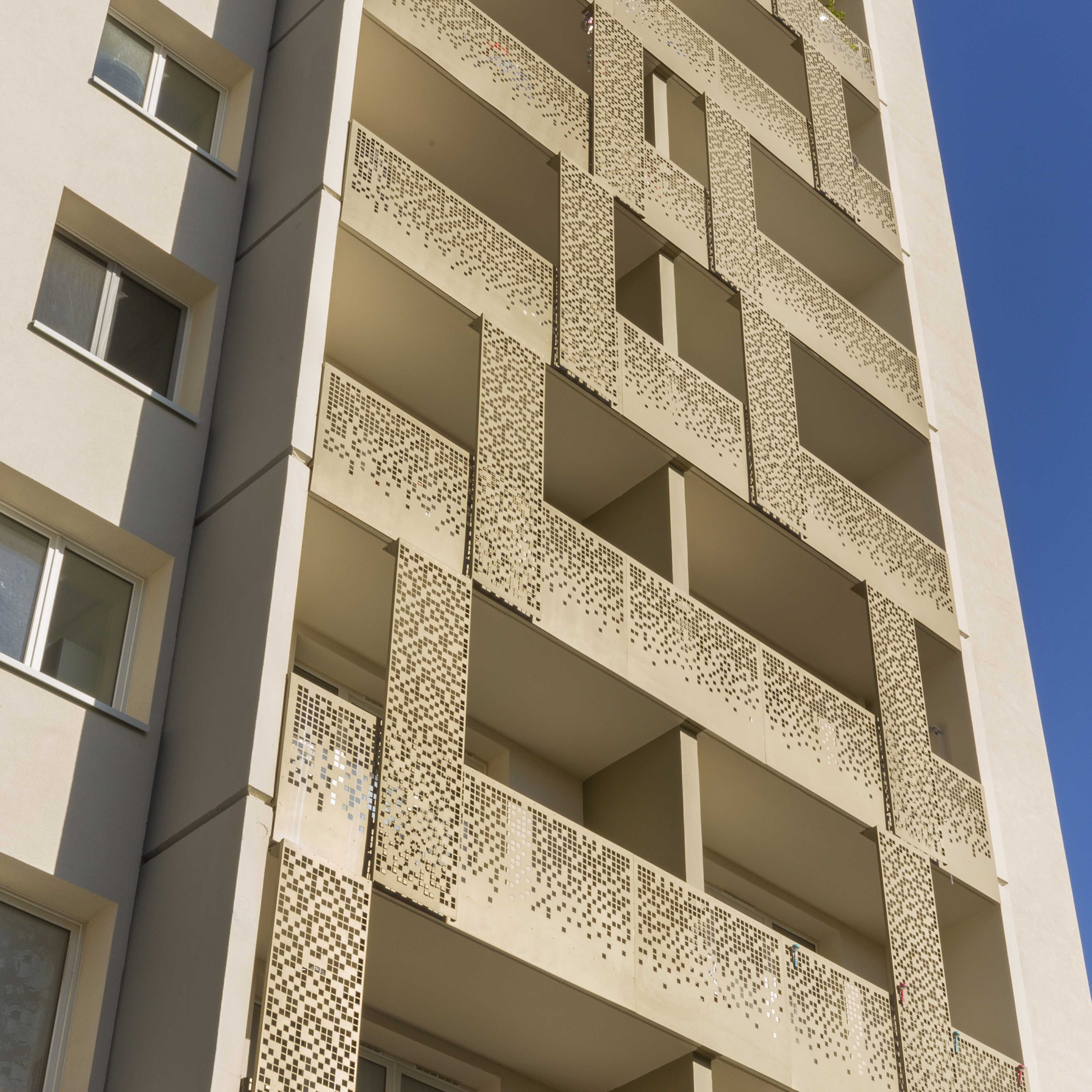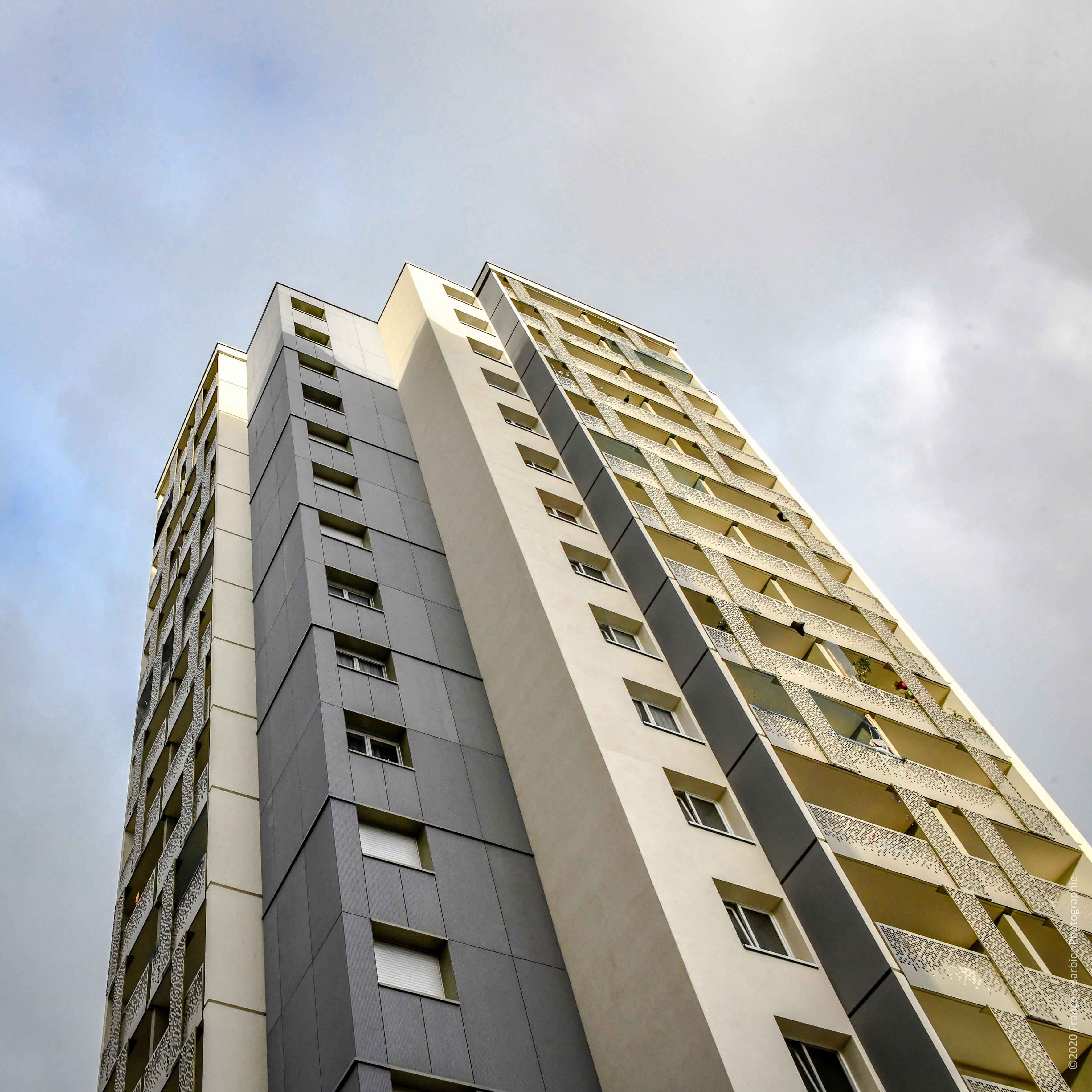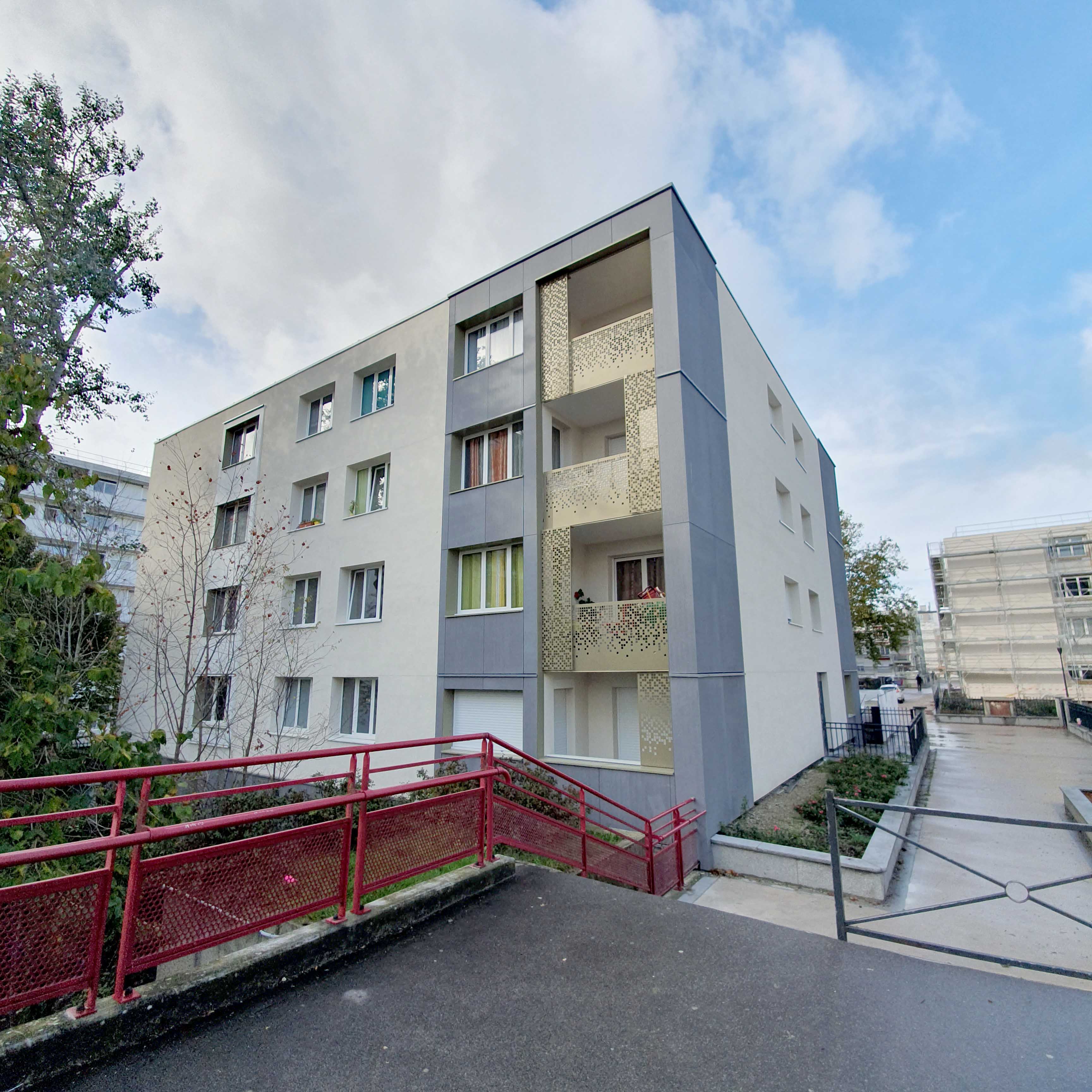 Réhabilitation en milieu occupé de 512 logements répartis sur 27 bâtiments et résidentialisation de l'ensemble : isolation des façades, isolation et étanchéité des toitures terrasses, VMC, remplacement des menuiseries extérieures, parties privatives (réfection des pièces humides, des installations électriques et des réseaux EC/EF) et des parties communes (embellissement, aménagement des locaux OM), création de 15 logements PMR