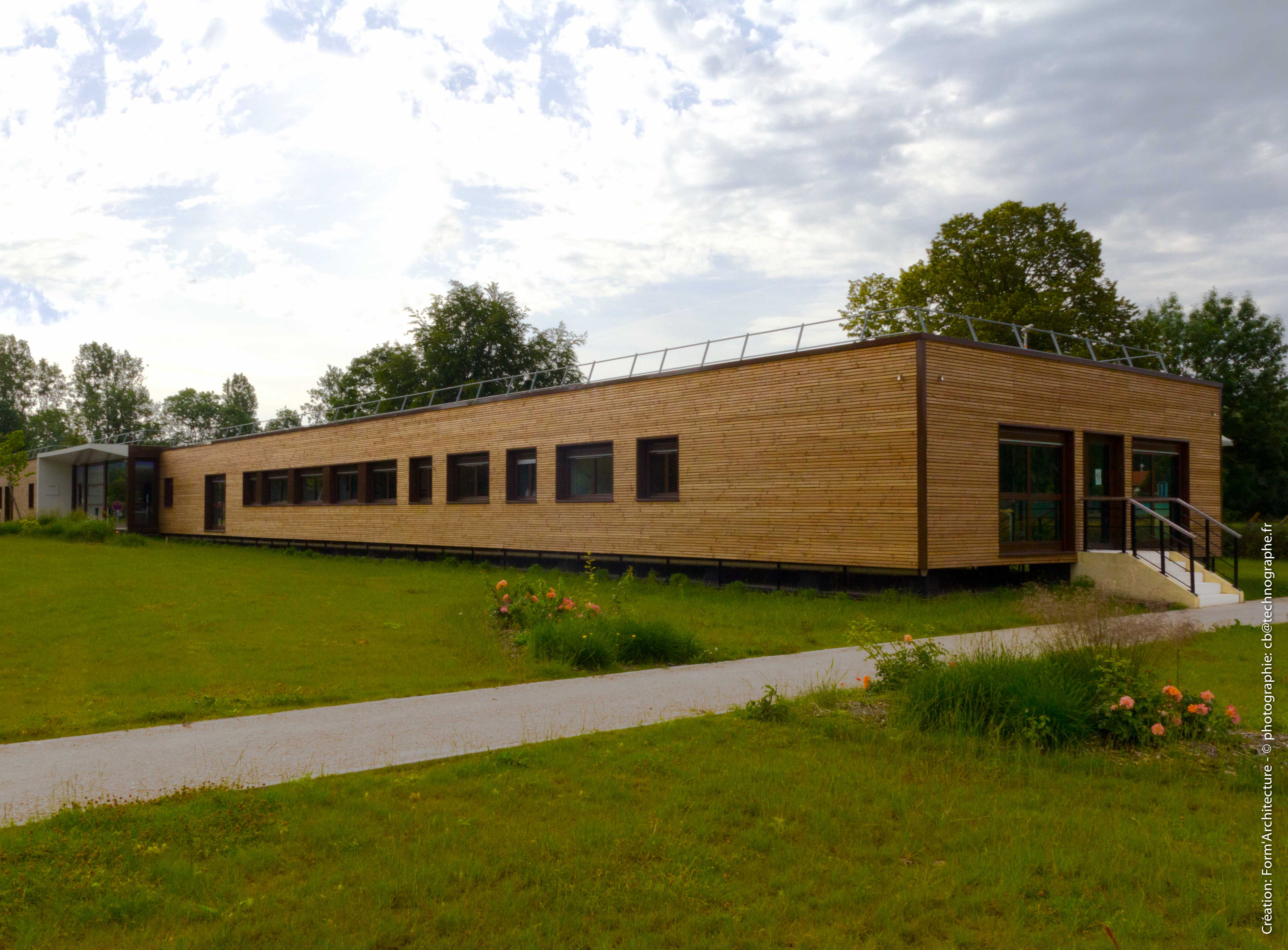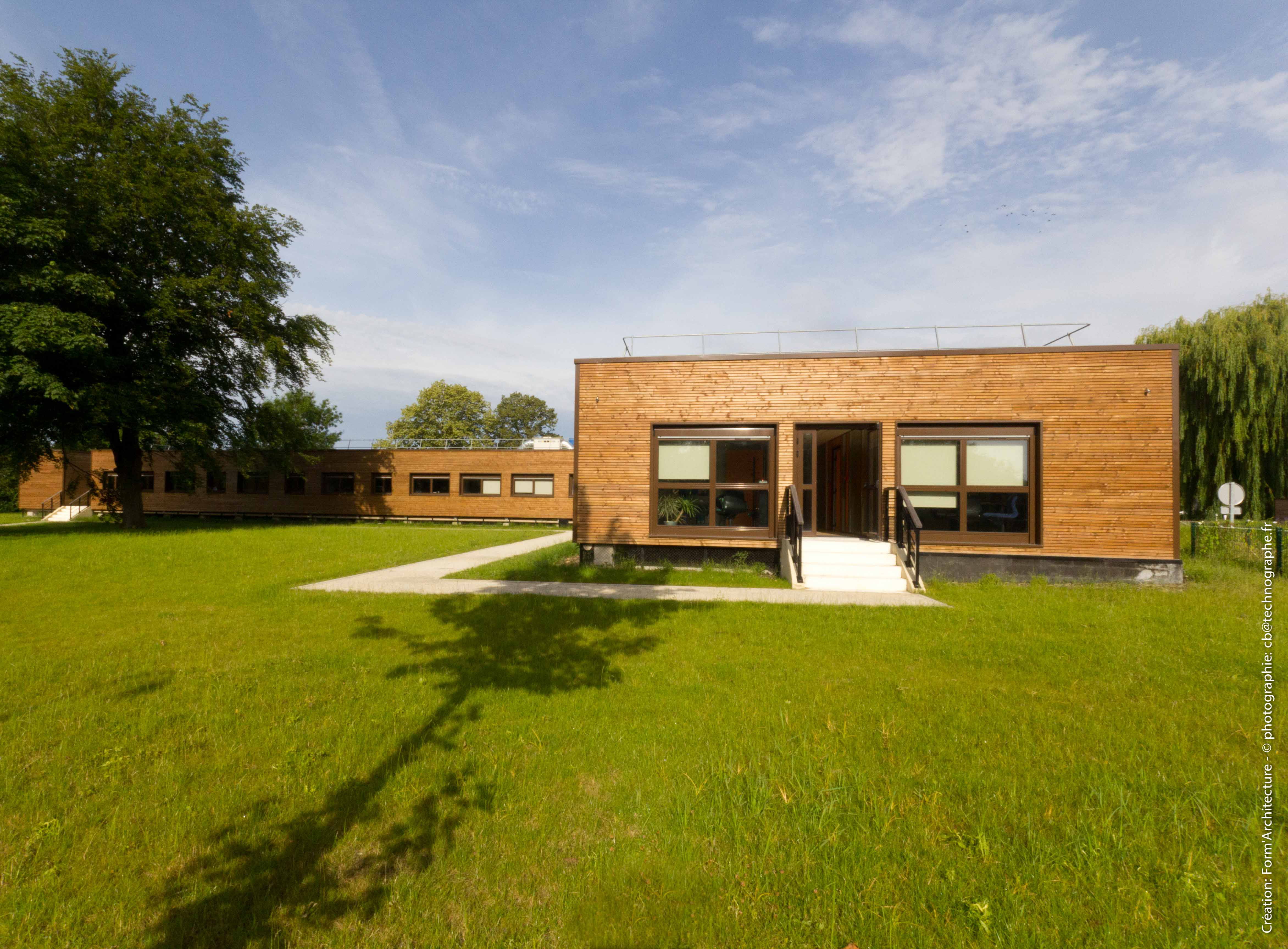 Création d'un bâtiment de bureaux BBC de 1200m² : isolation thermique 6 faces, récupération d'eaux pluviales, panneaux photovoltaïques en brise soleil, ventilation double flux