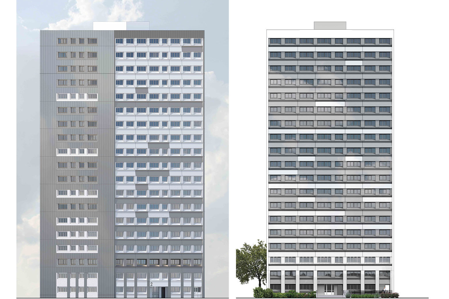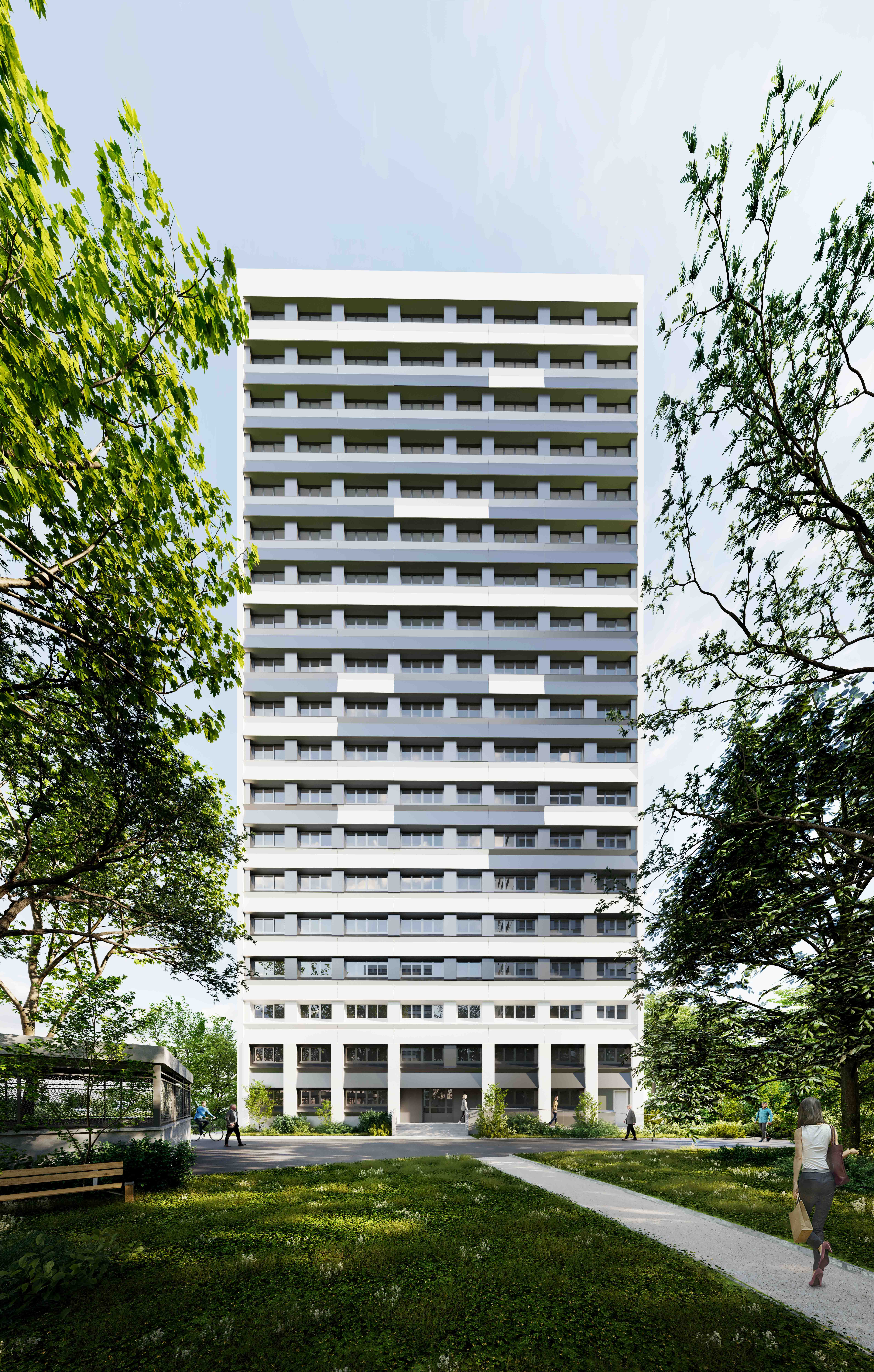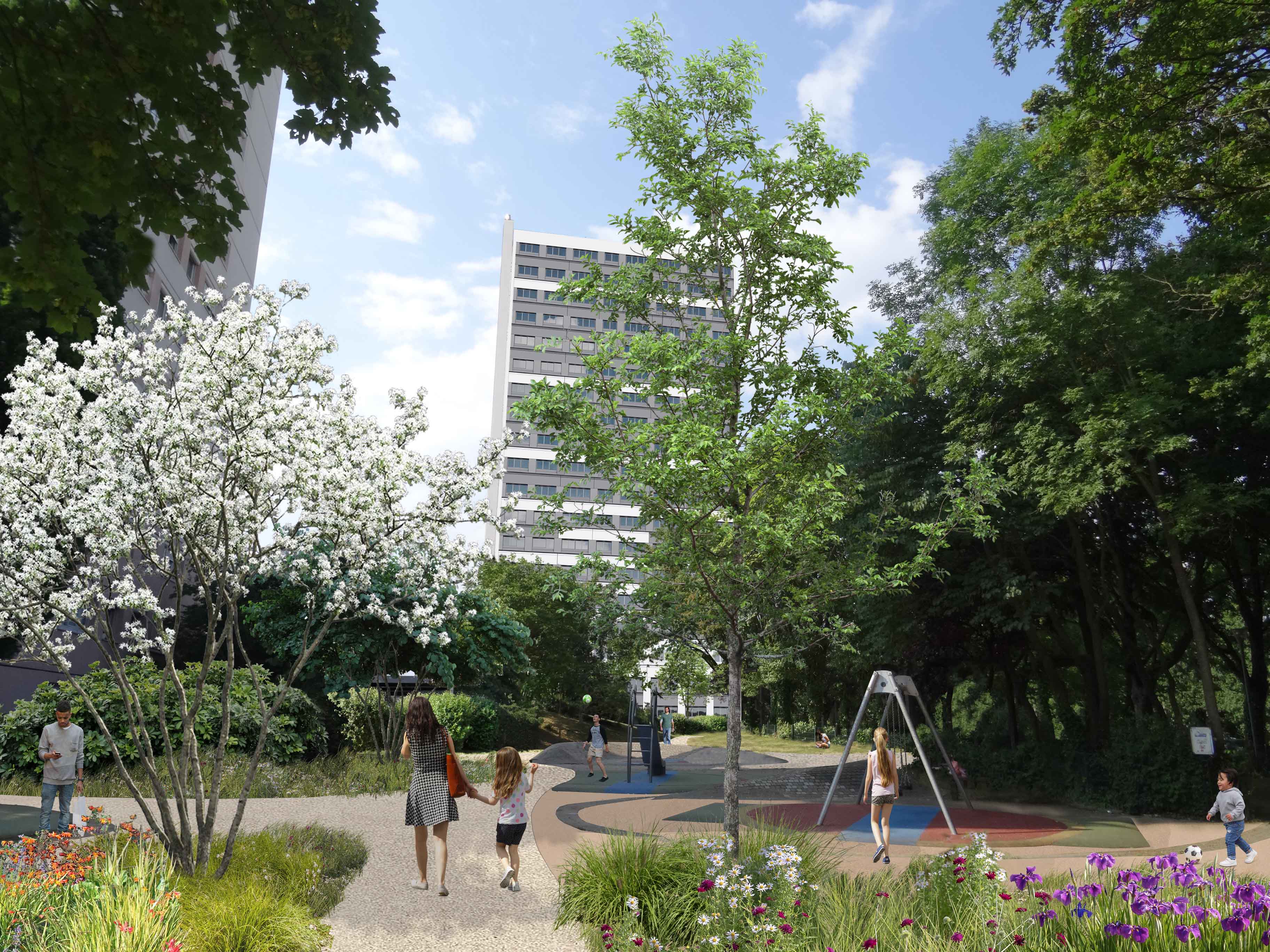 Requalification de l'aspect architectural du bâti pour un changement complet de l'image de la résidence à l'échelle du quartier, amélioration des performances thermiques (ITE, menuiseries extérieures, toitures terrasses, robinets thermostatiques, chauffage, VMC), amélioration des parties privatives (embellissement des pièces humides, adaptation de 60 logements PMR) et communes (embellissement, contrôle d'accès, électricité, éclairage, sécurité incendie, loge gardies, locaux annexes), requalification des espaces extérieurs pour une meilleure appropriation des espaces par les locataires et une sécurisation de la résidence (espaces verts, cheminements, aires de jeux, éclairage extérieur)
