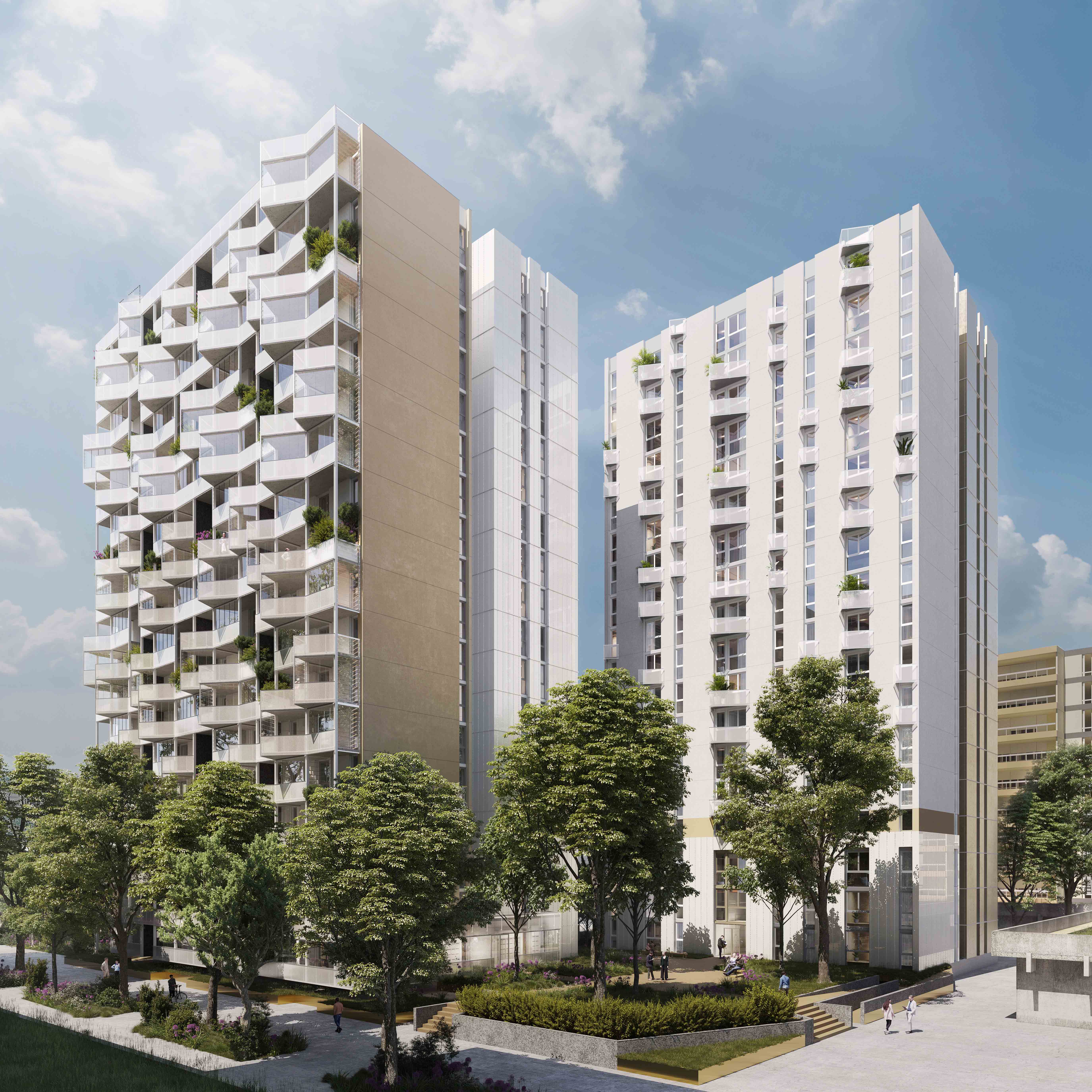 Trois des quatre tours se voient habillées d’une enveloppe bioclimatique qui forme extension (financement ANRU). Cela permet une réinvention profonde des usages et des façades.