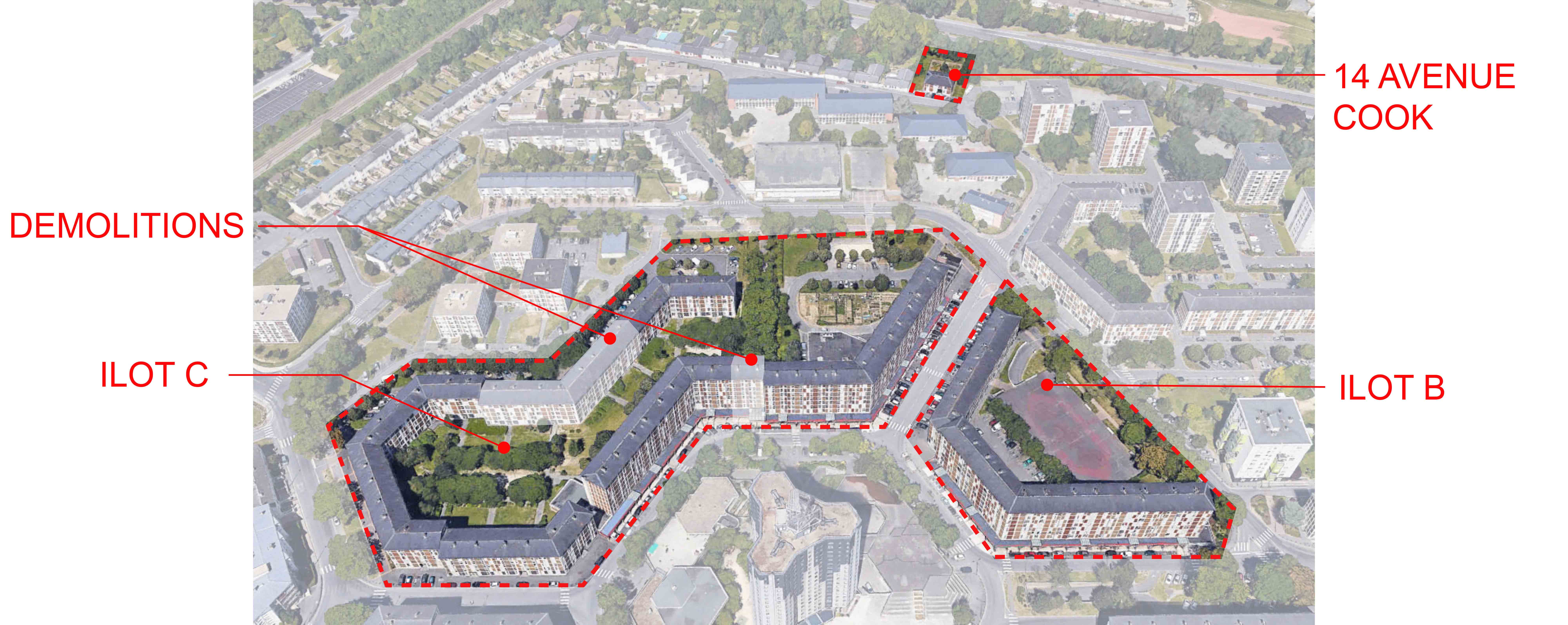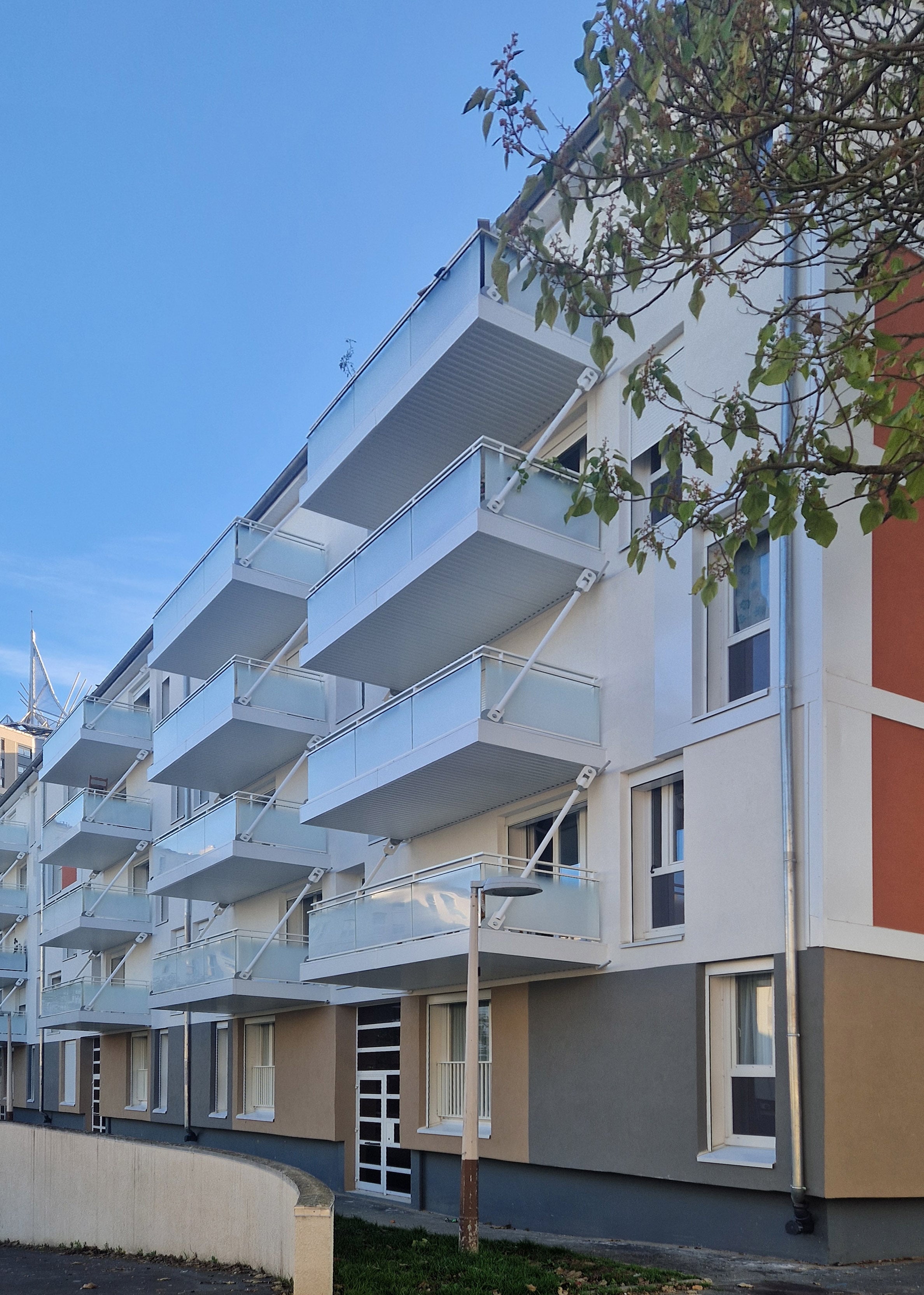 Réhabilitation de 425 logements en milieu occupé, traitement de l’enveloppe thermique, création de balcons, démolition de 14 logements, aménagement des espaces extérieurs