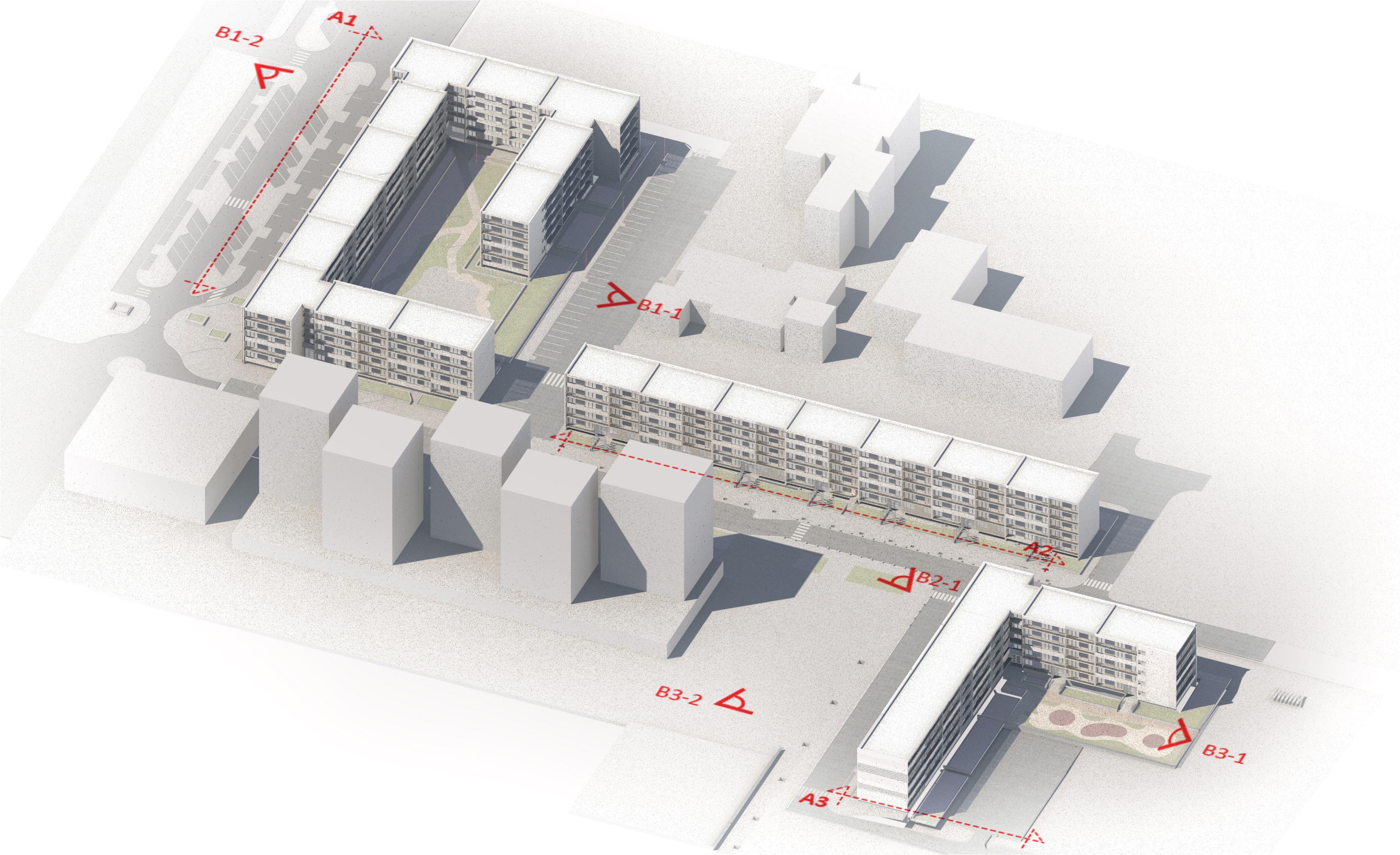 Architecturalement, nous reprenons et accentuons les éléments forts et qualitatifs de la résidence, tout en lui donnant un caractère à la fois contemporain, sobre, résidentiel et surtout intemporel. Pour pallier l’impression d’étalement des barres, nous cherchons à provoquer un effet d’élancement et redécoupage à une l’échelle de tissu plus stratifié avec des ruptures franches dans la linéarité. De grands cadres blancs structurent ainsi le quartier et rythme les entrées d’immeubles, entre les cadres pleins, des séquences réchauffées avec les gardes corps.