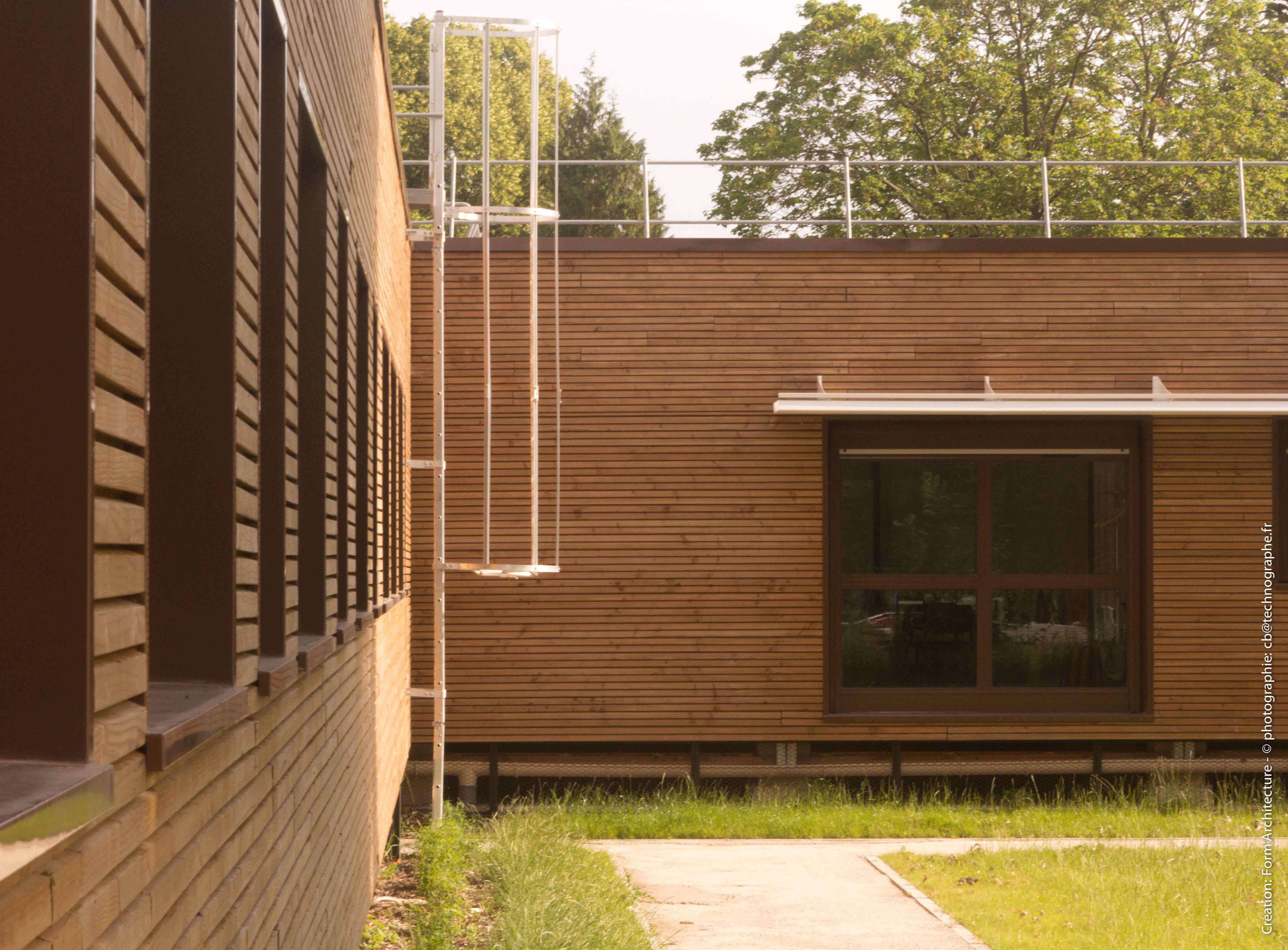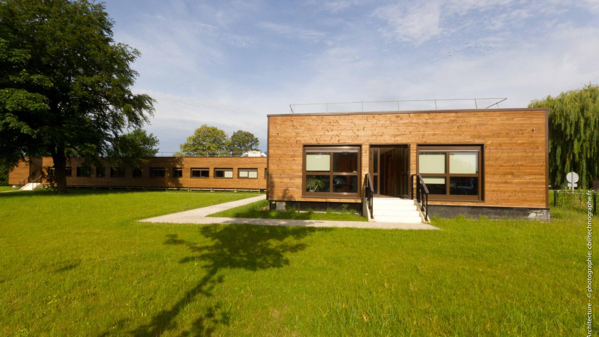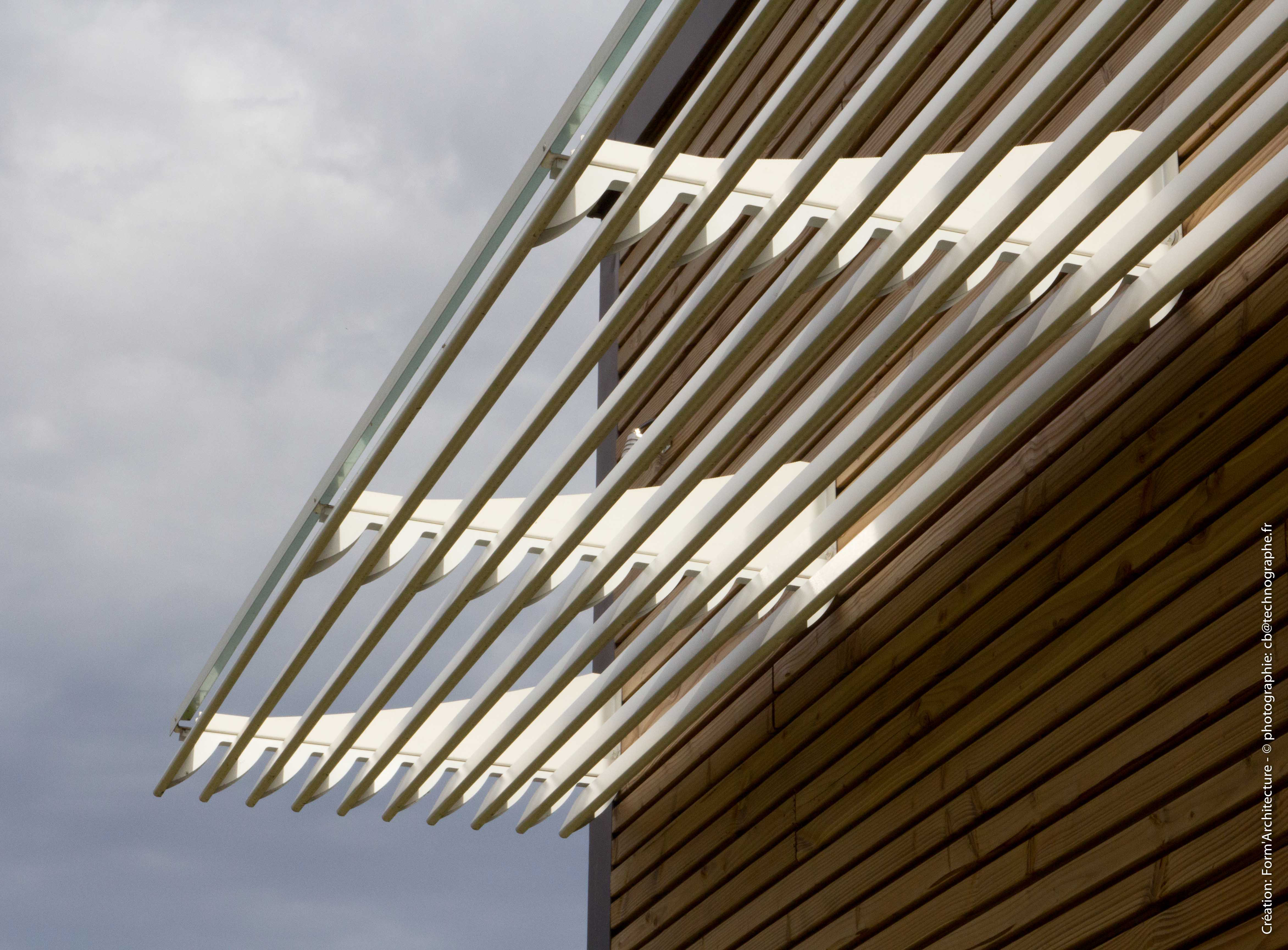 Création d'un bâtiment de bureaux BBC de 1200m² : isolation thermique 6 faces, récupération d'eaux pluviales, panneaux photovoltaïques en brise soleil, ventilation double flux