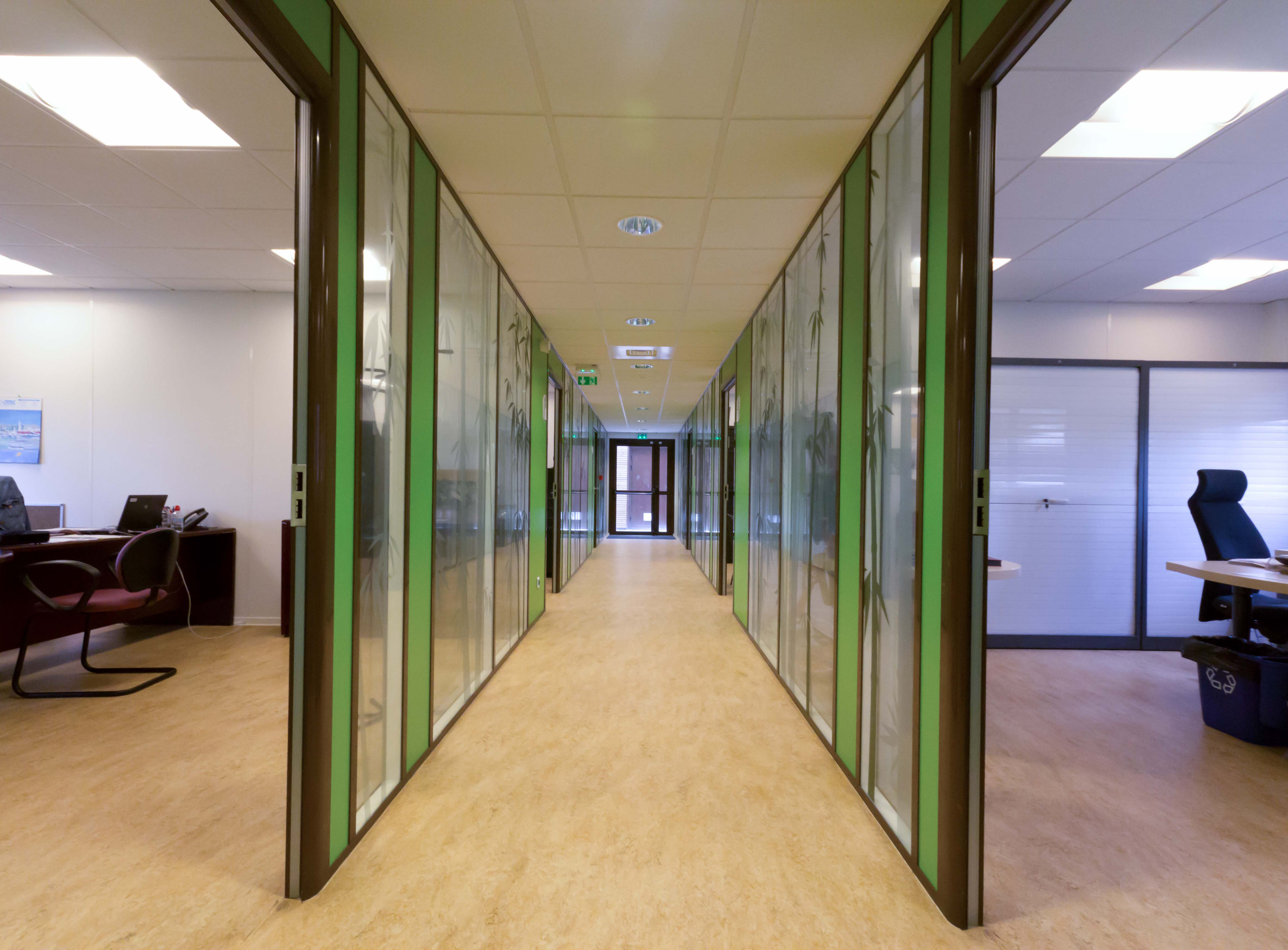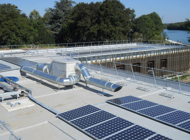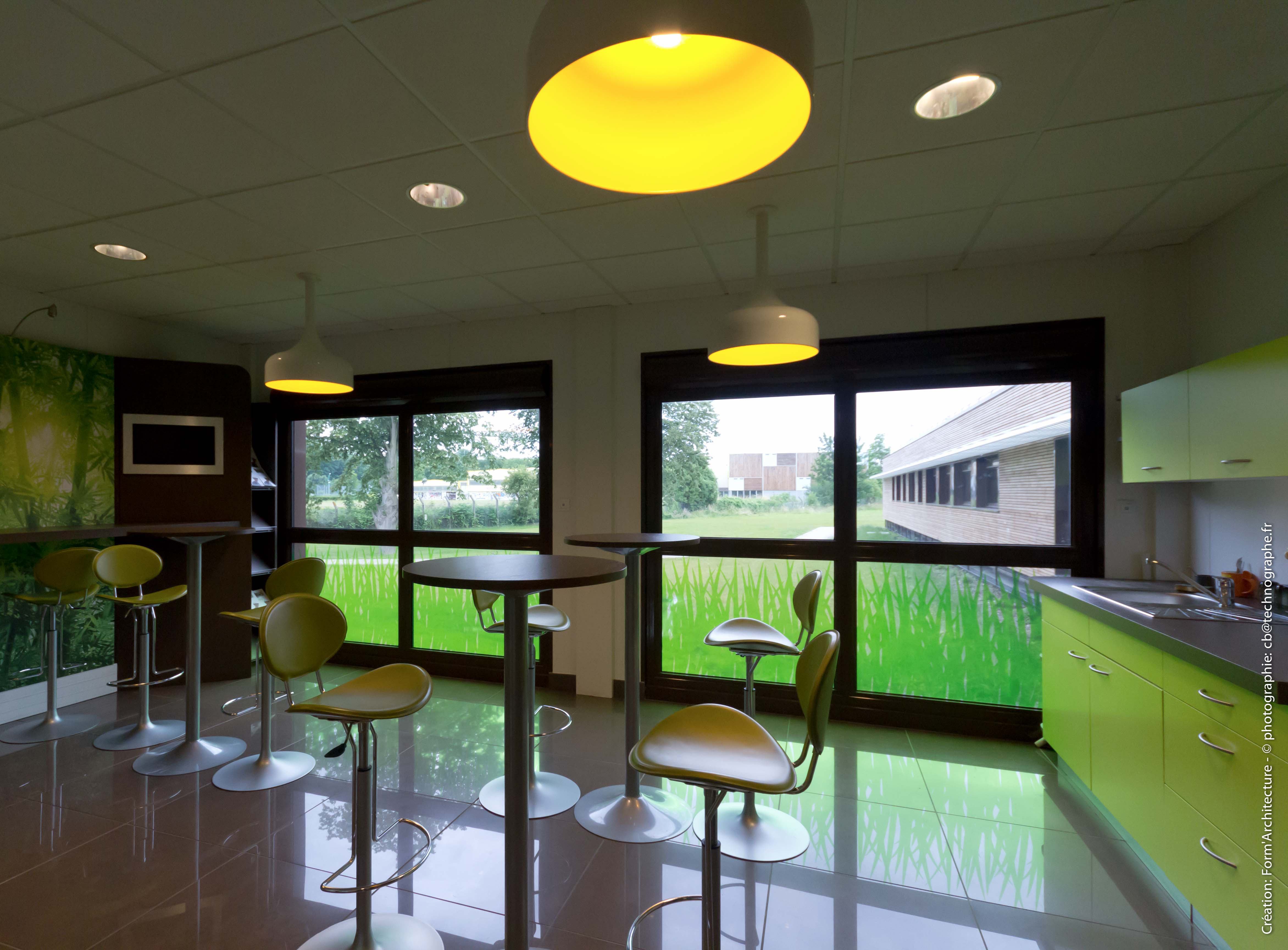 Création d'un bâtiment de bureaux BBC de 1200m² : isolation thermique 6 faces, récupération d'eaux pluviales, panneaux photovoltaïques en brise soleil, ventilation double flux