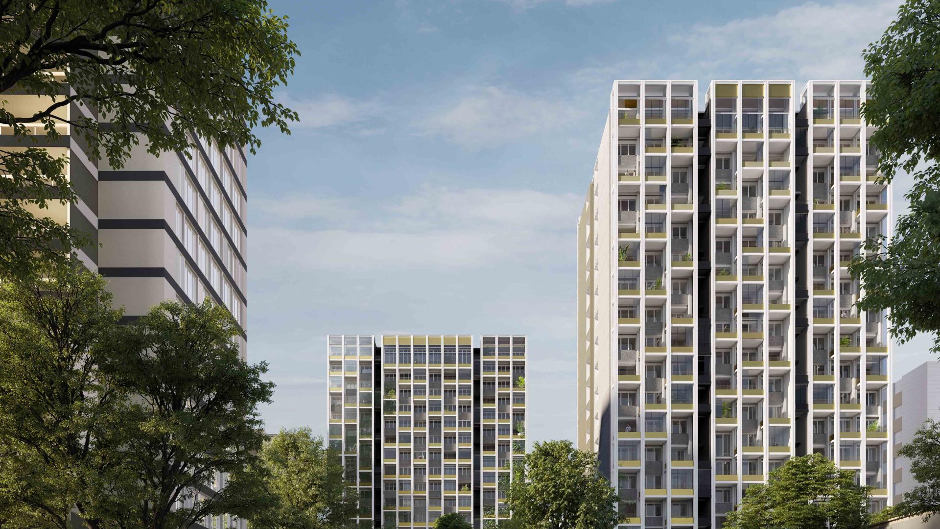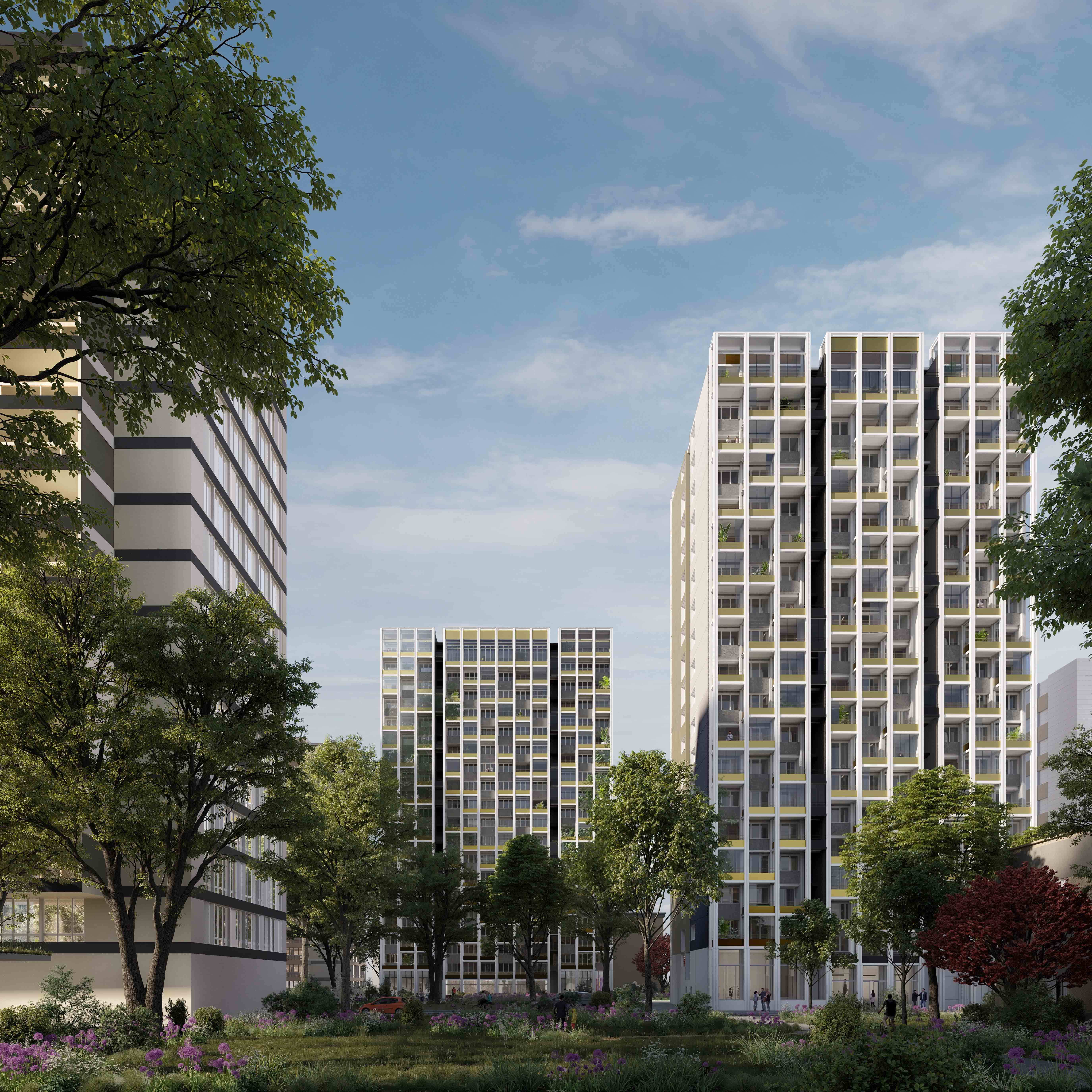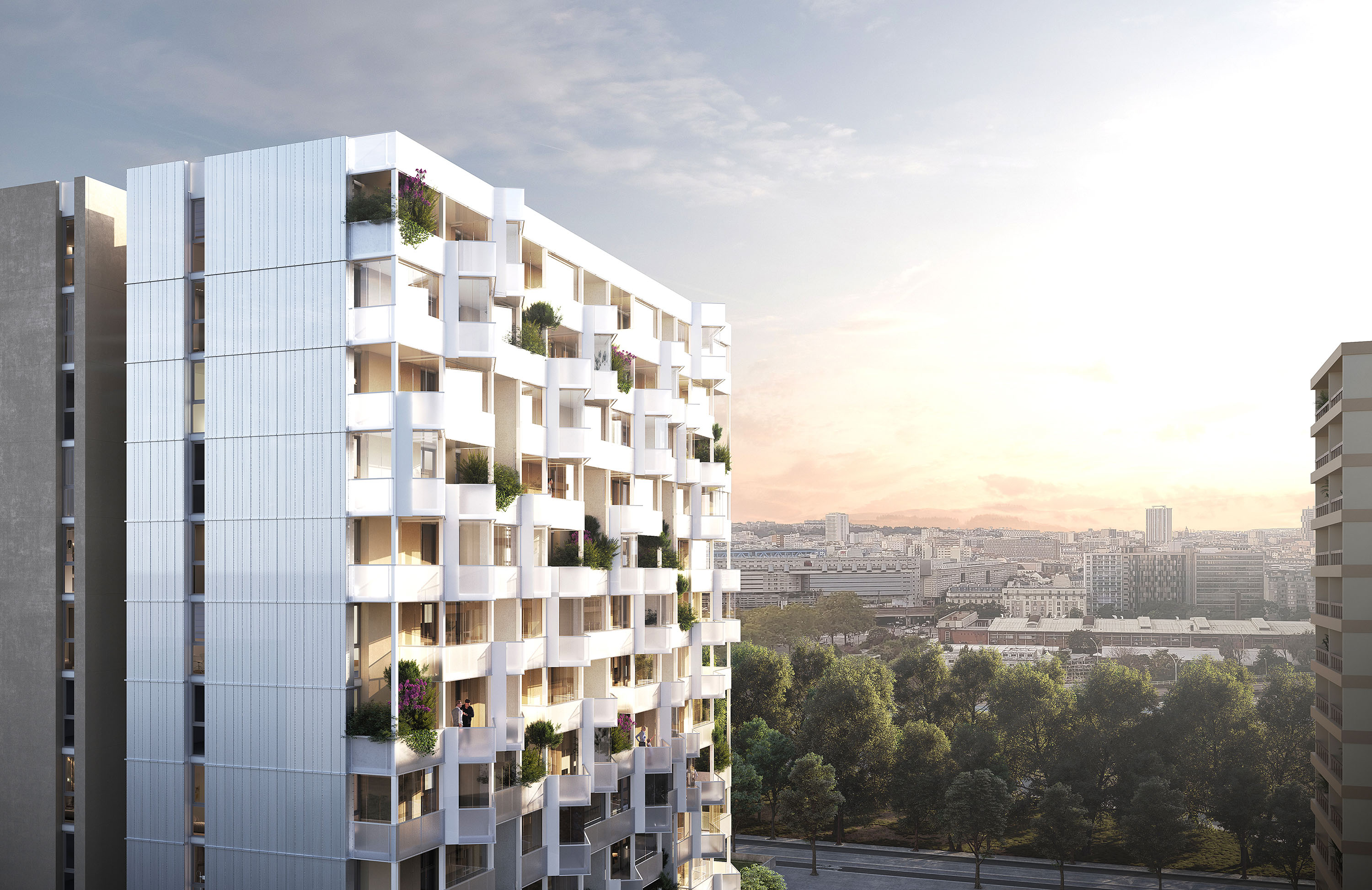 Trois des quatre tours se voient habillées d’une enveloppe bioclimatique qui forme extension (financement ANRU). Cela permet une réinvention profonde des usages et des façades.