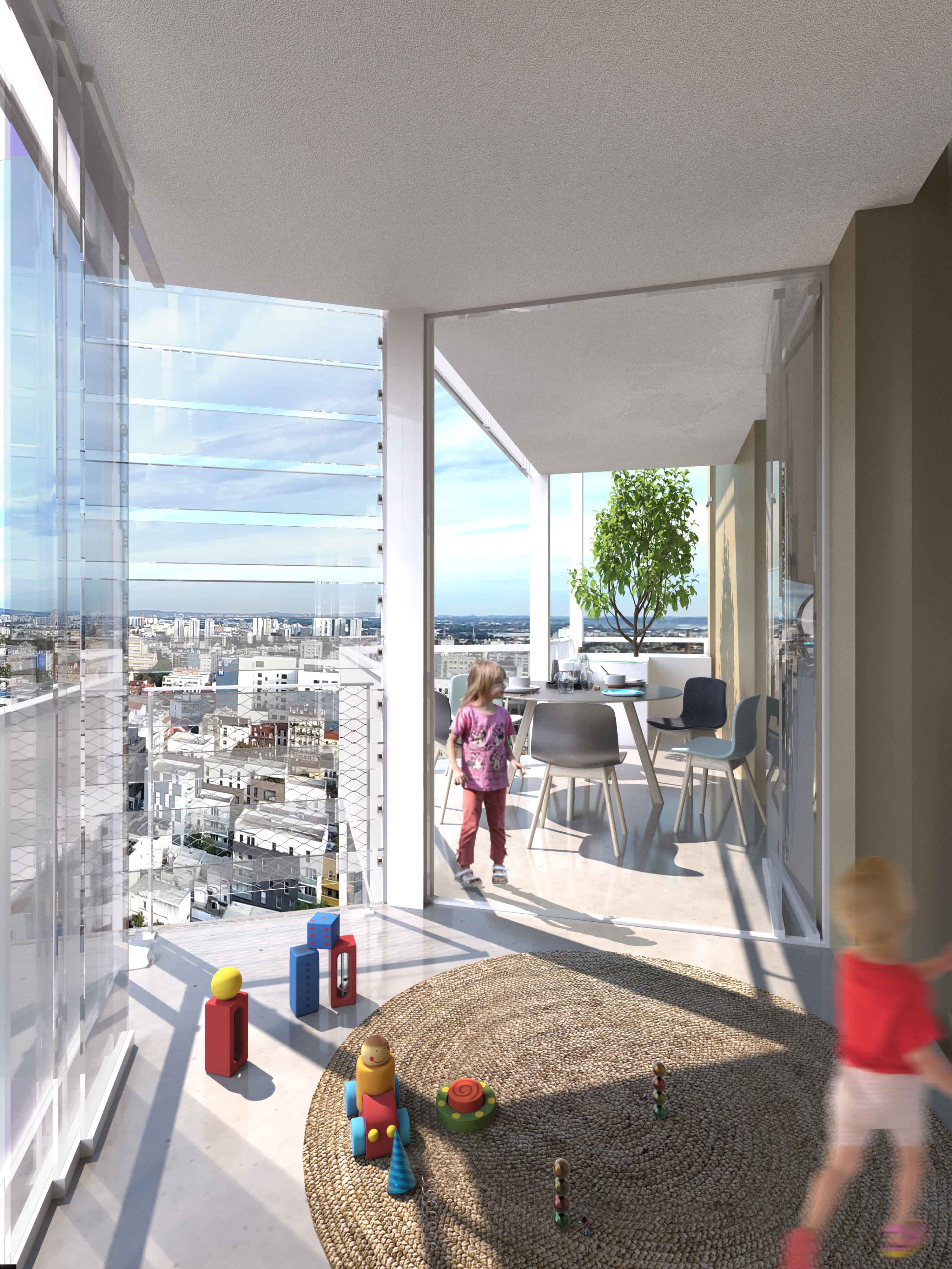 Ainsi, chaque logement est équipé d’un jardin d’hiver fermé et d’un balcon. Notre équipe fait toutefois le choix d’un traitement de qualité sur la 4ème tour afin de ne pas « délaisser » une soeur.