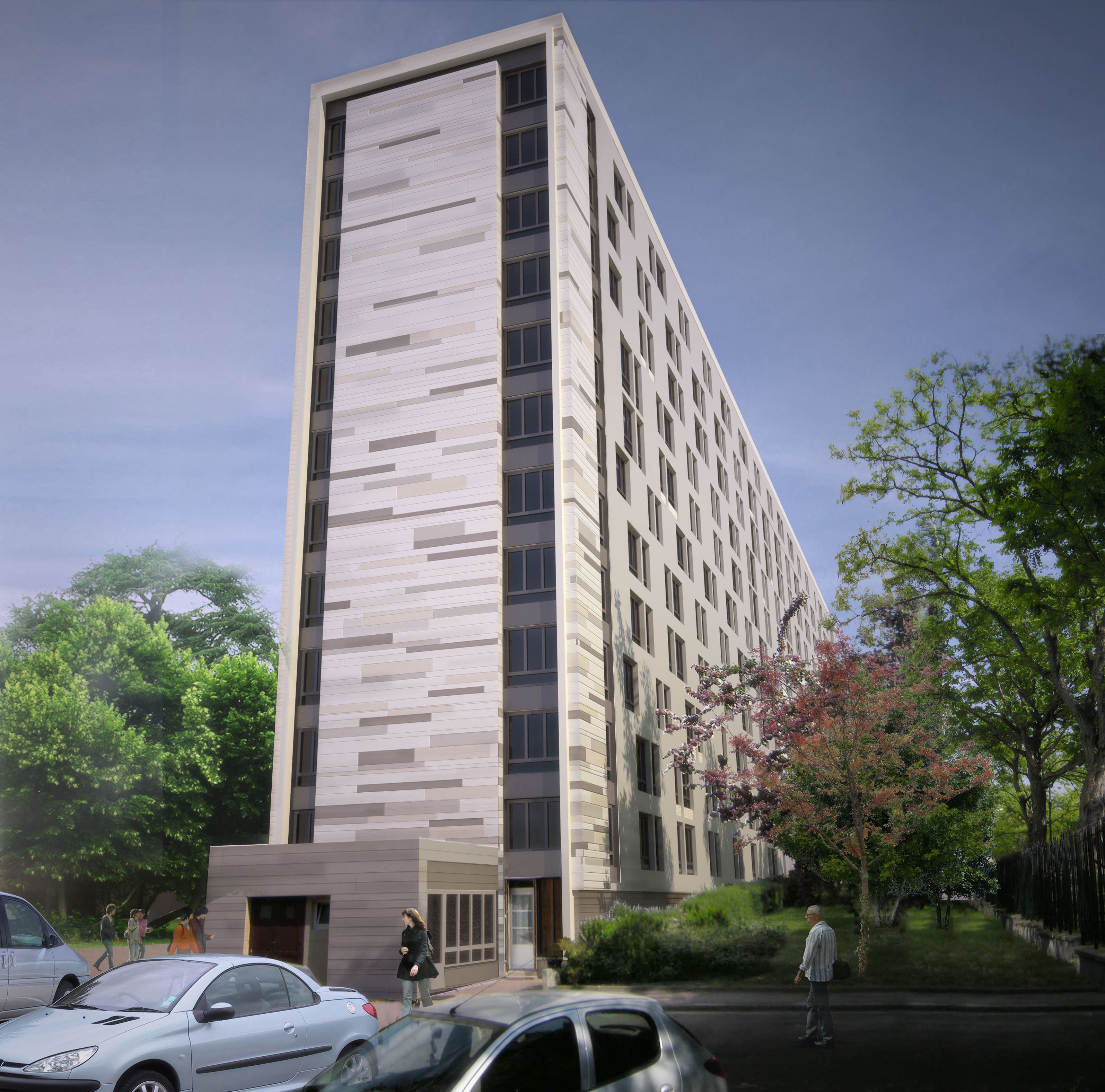 Réhabilitation et amélioration des performances thermiques d'un ensemble de 156 logements en milieu occupé : façades, étanchéité des toitures terrasses, menuiseries extérieures, ventilation, chaudières, flocage des sous-sols, contrôle solaire.