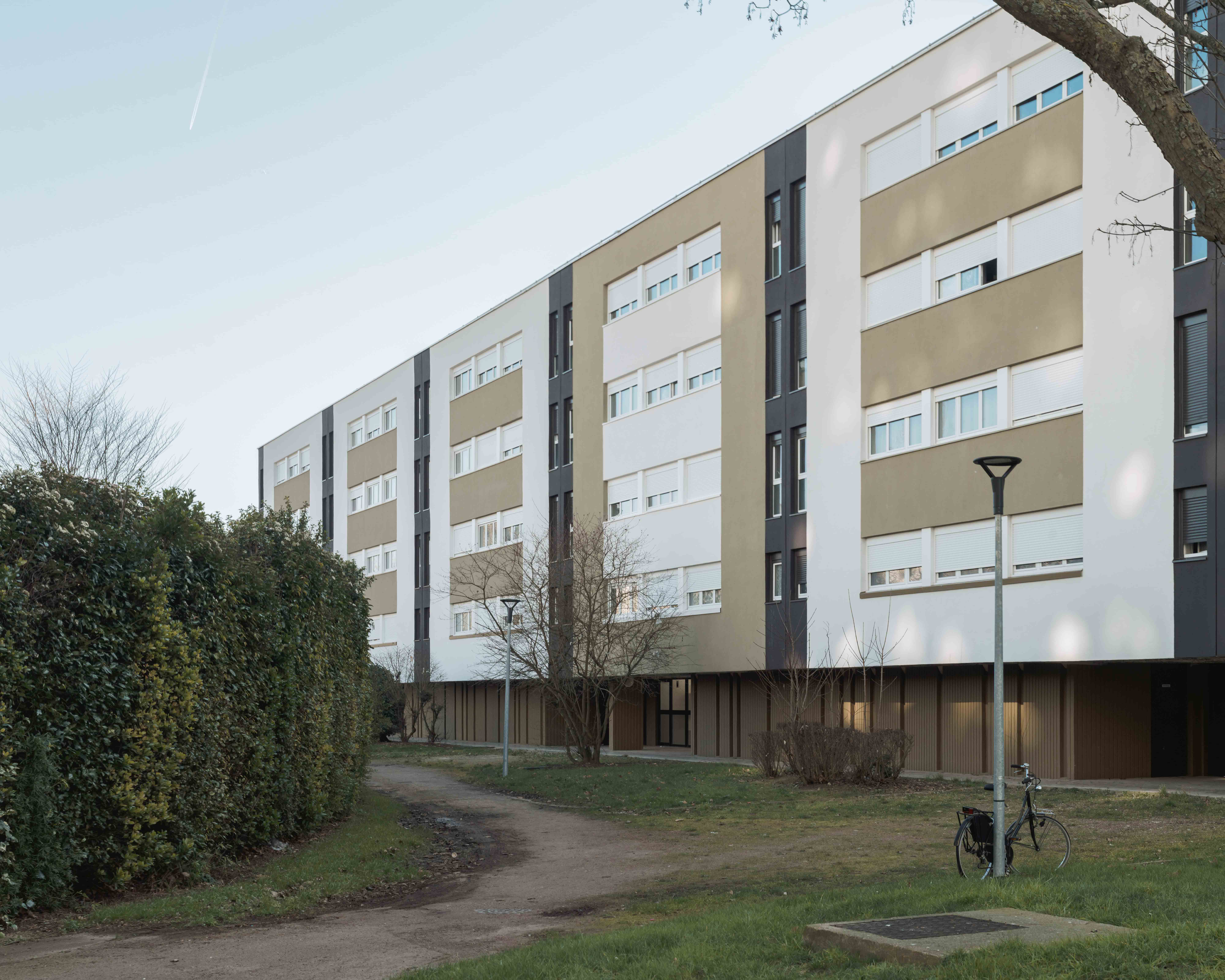 Réhabilitation énergétique de 589 logements en milieu occupé, création de 10 logements PMR et aménagement du centre commercial.