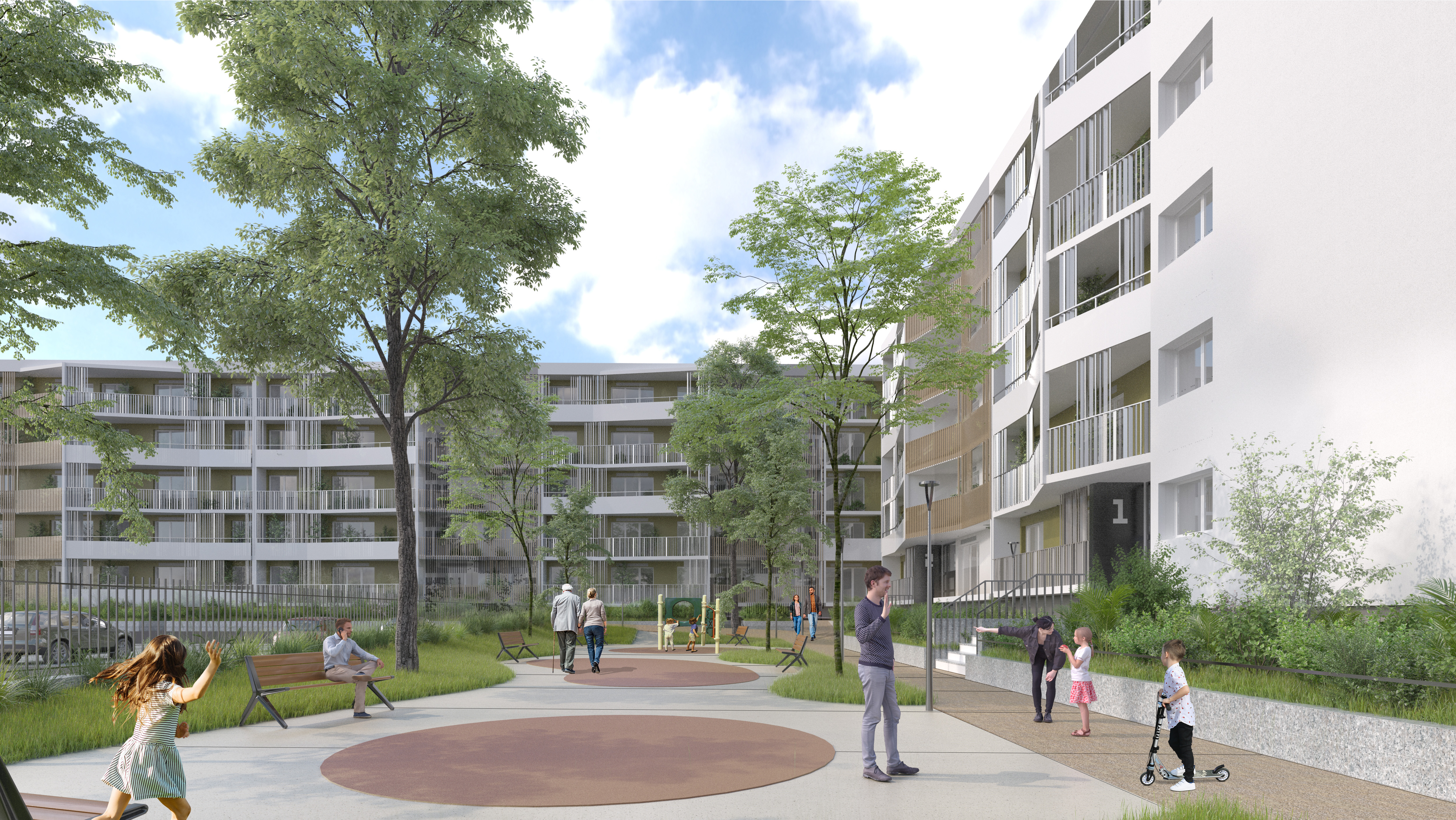 Nous donnons une sensation de légèreté à l’ensemble en le décollant du sol par un soubassement foncé. Une attention toute particulière est donnée aux gardes corps. Ils attirent l’œil sur le jeu d’ombre en fond de balcon et donnera la personnalité à la résidence. D’une grande sobriété, ils sont de typologies différentes selon le nouveau découpage des bâtiments, par cage d’escalier : barreaudage métallique gris, claustrât simili bois et garde-corps plein. Le choix de décliner les mêmes matériaux sur l’ensemble de la résidence affirme une unité urbaine.