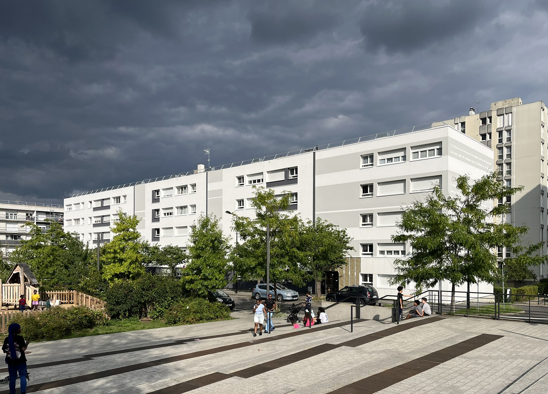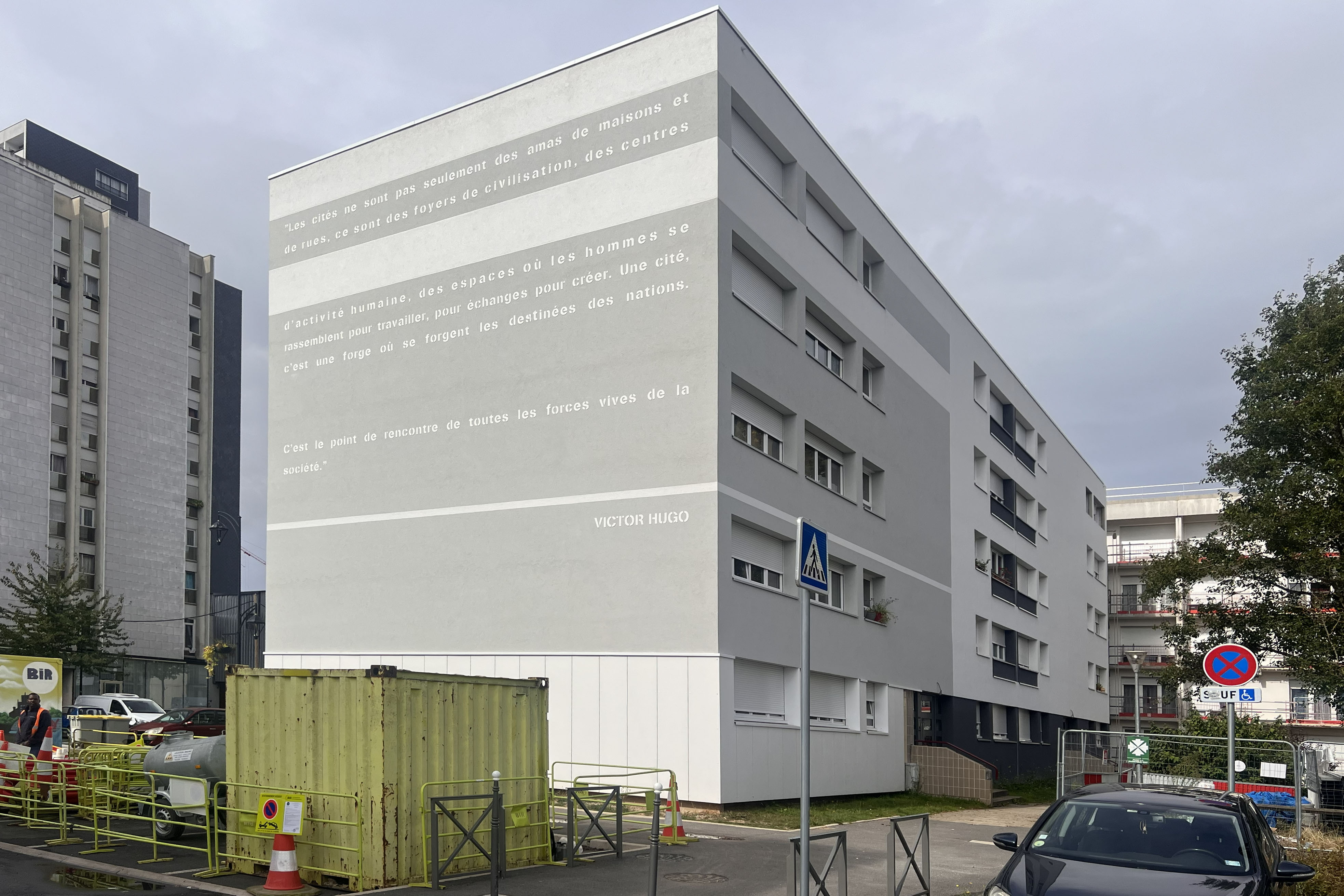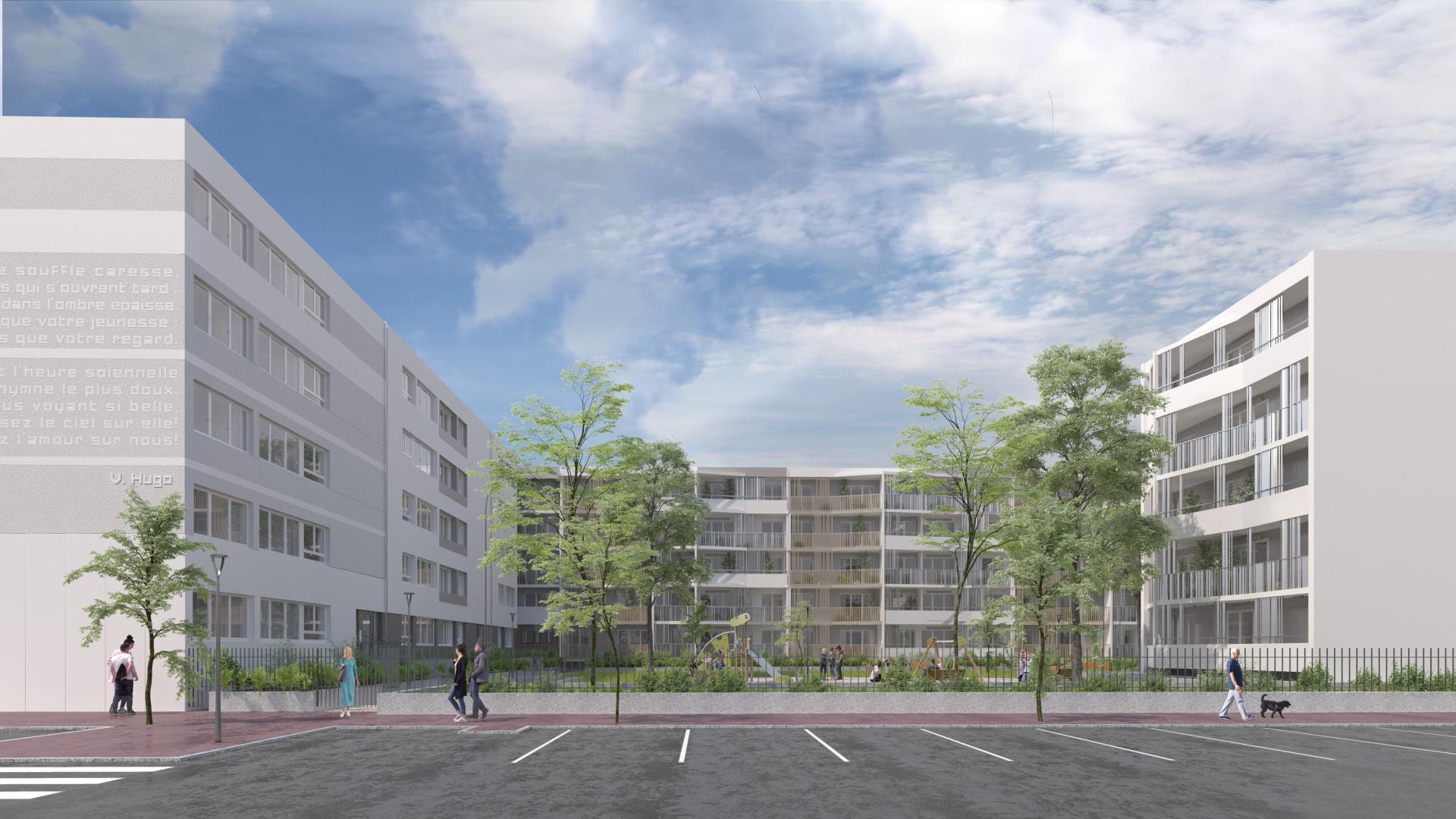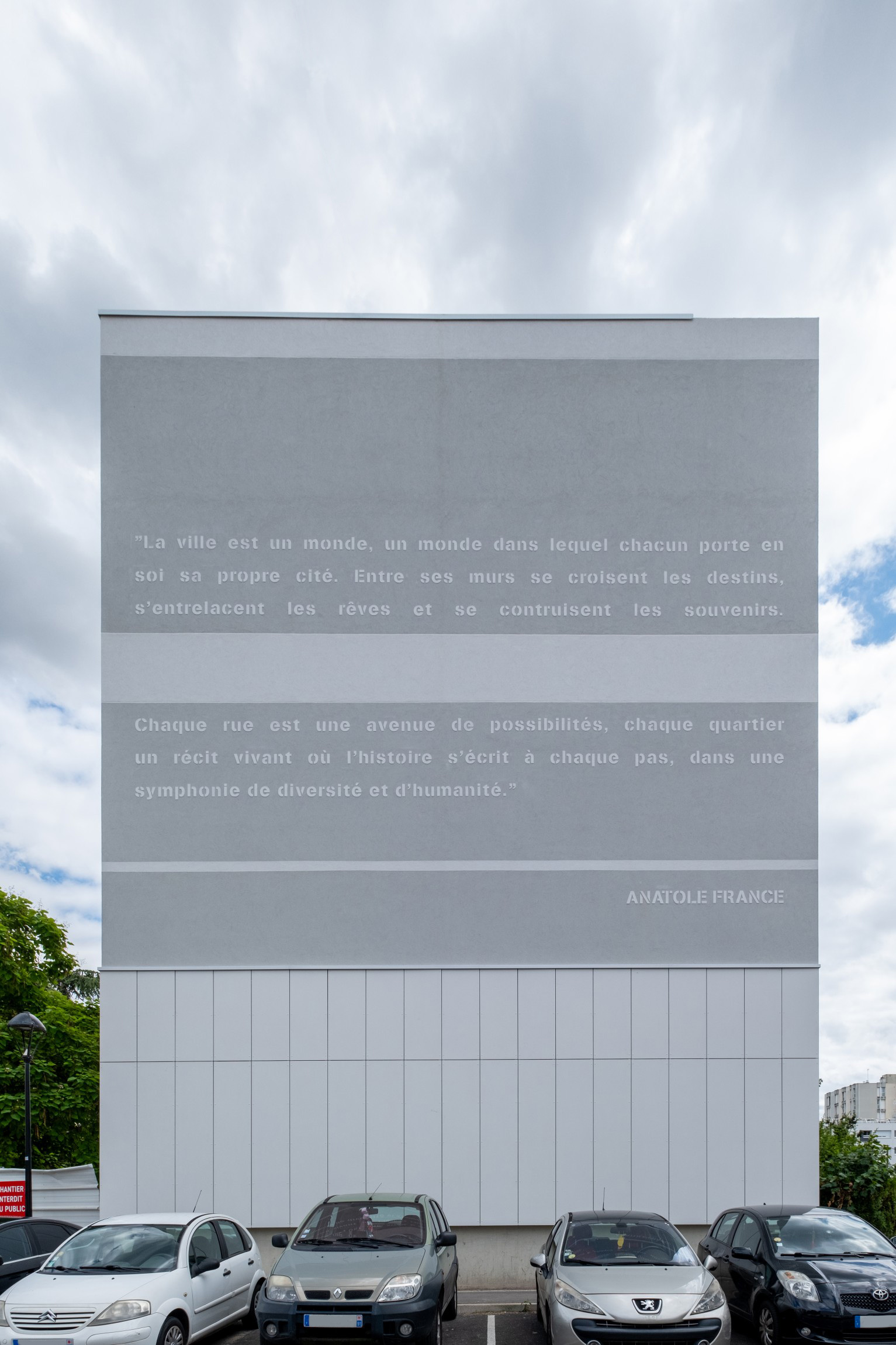 En liaison avec le quartier, les pignons sont agrémentés d’un texte subtilement engravé dans l’enduit, créant l’évènement du côté des espaces publics. Référence directe au quartier des écrivains et du nom des rues, la typographie joue ici le rôle d’ornementation pour rappeler les grandes horizontales des bâtiments. Portant des textes poétiques, les pignons se tournent maintenant à un paysage plus urbain et contemporain. La sélection des textes d’auteurs classiques pourra être l’occasion d’ateliers participatifs avec les habitants.
