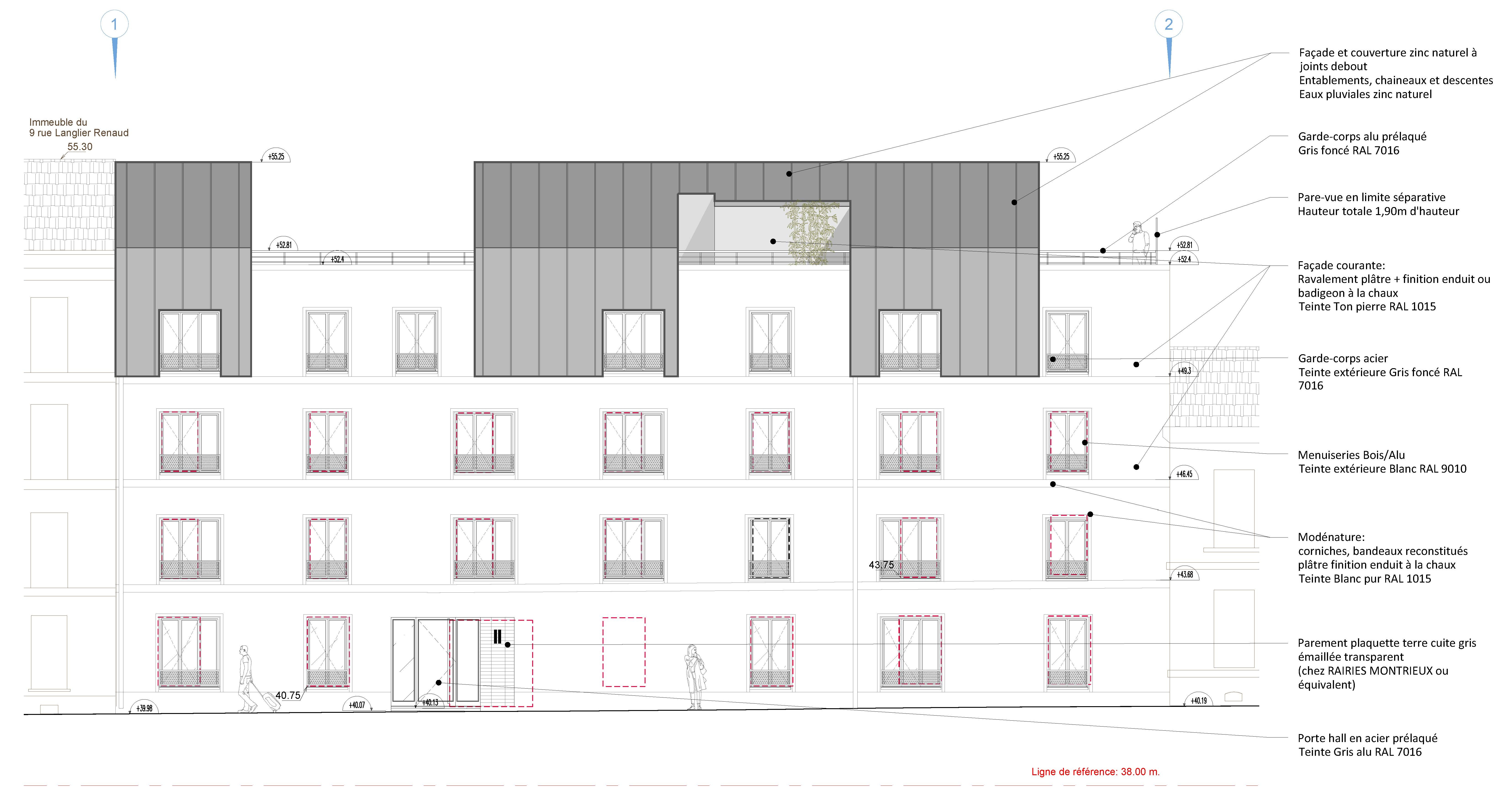 bardage zinc ; plaquette terre cuite en RDC cour), toiture zinc naturel et toitures terrasses accessibles sur plots et végétalisées en partie, menuiseries mixtes bois et aluminium, panneaux photovoltaïques en toiture, récupération des eaux pluviales